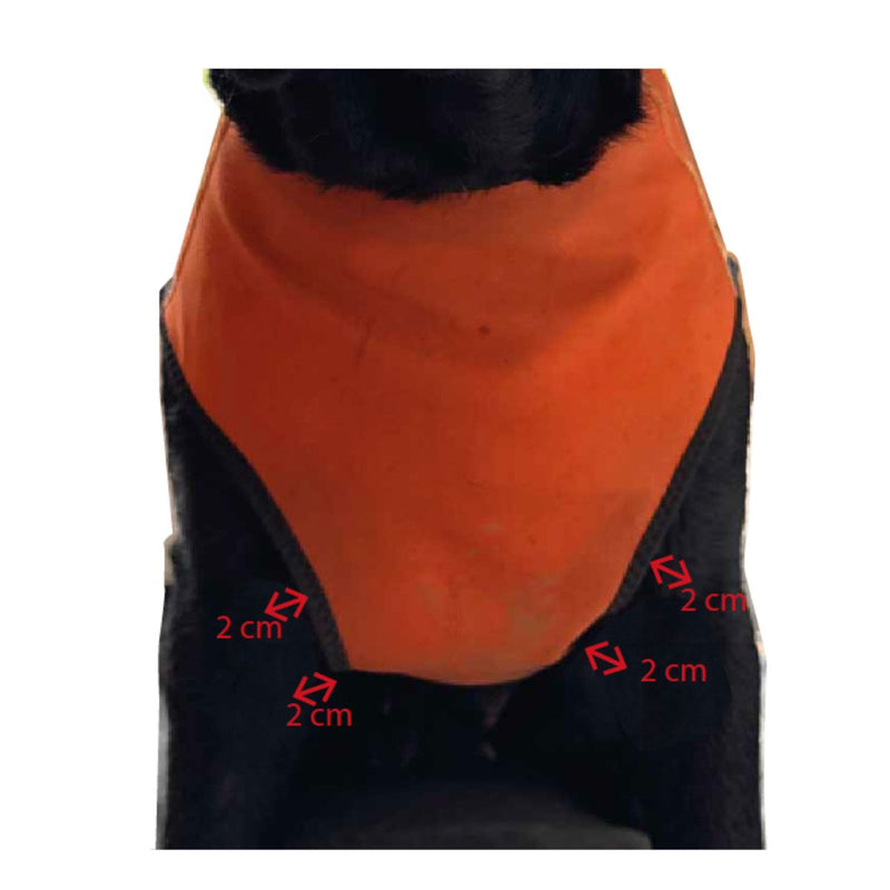 - Under the belly, there should also be 2 cm of space between the front leg and the vest on each side.